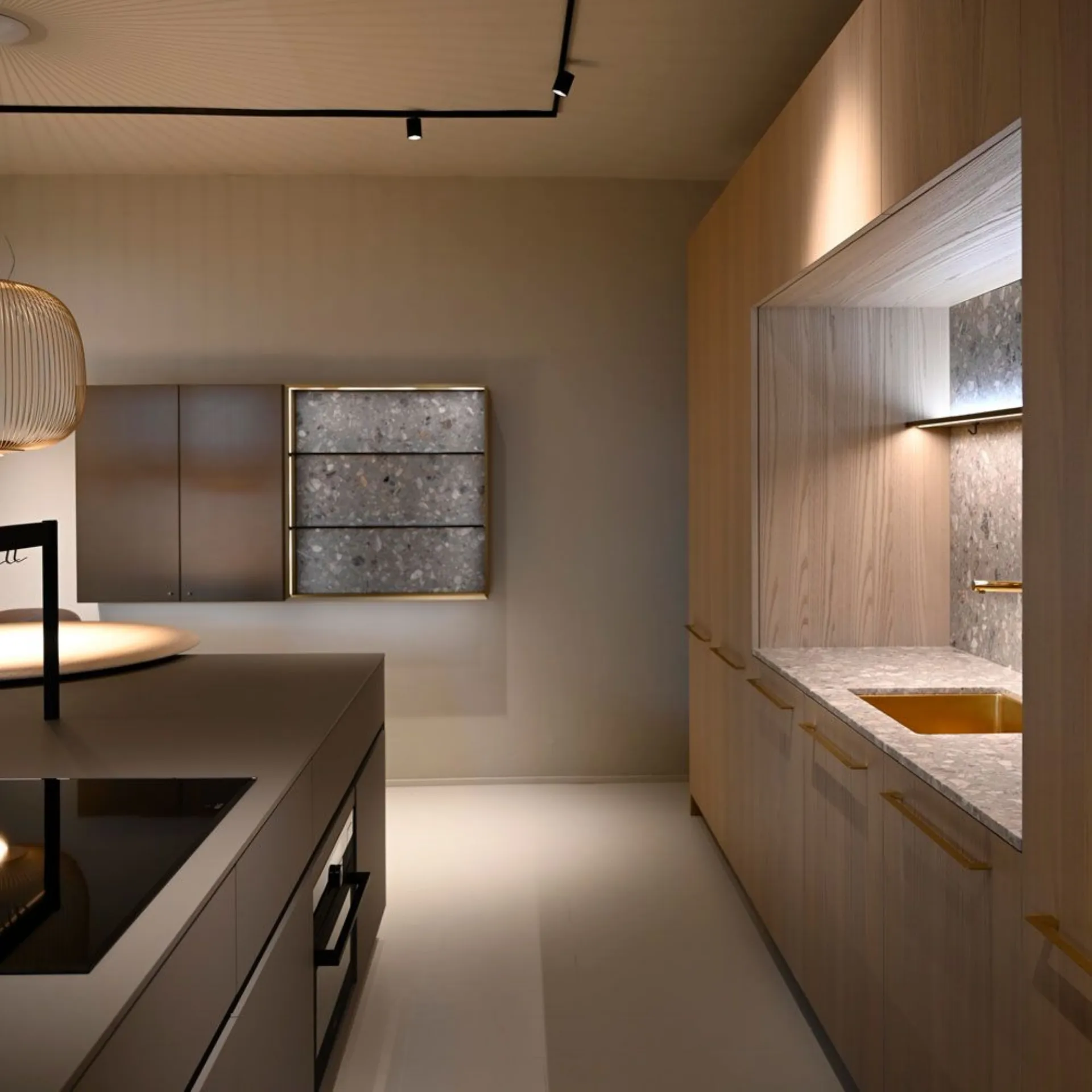 Zoccolo H.10 in alluminio fin.champagne, completa di accessori porta posate Premiere in legno e lampada Across 150cm. Piano top sp.2cm in marmo seminato fior di pesco PN22 con foro piano cottura standard. Piano snack in appoggio Platform D120 fin.impiallacciato olmo sbiancato.